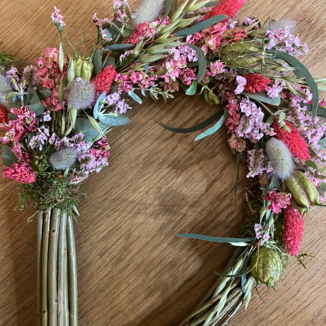 Kit contains: Willow, wire, bidding wire, moss, velvet ribbon, bunny tail grasses, dyed phalis grass, nigella seed heads, oats blue eucalyptus, Nicoli, pink limonium and video tutorial.