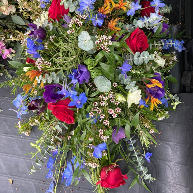 Bright and eye catching, filled with roses, blue delphinium and anemones.